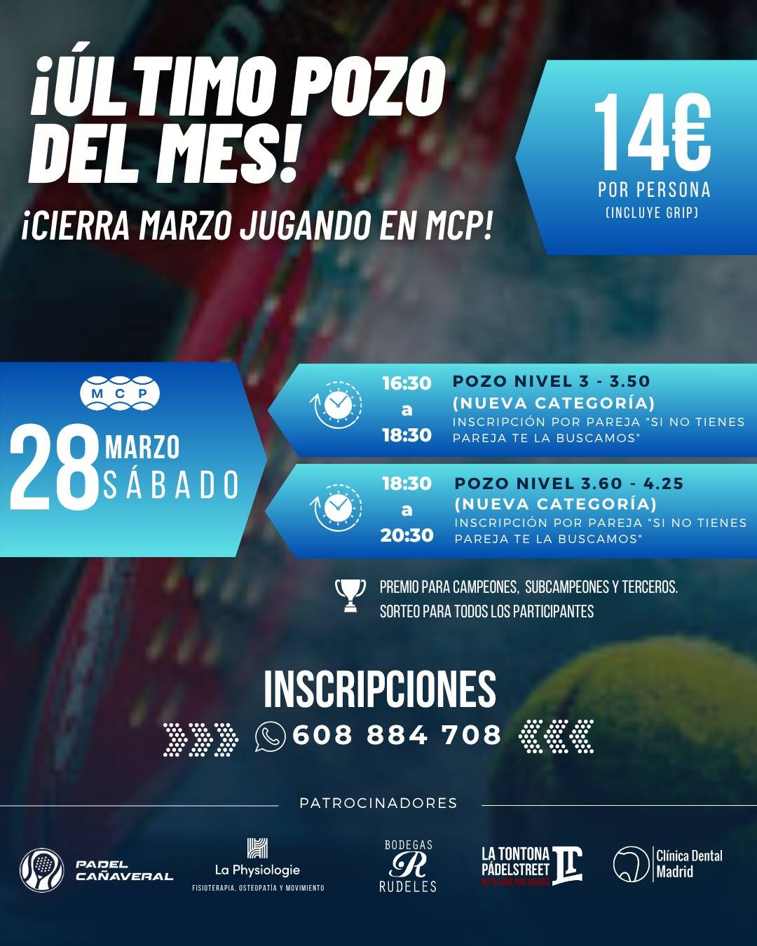 ¡¡¡¡POZO MCP para terminar el mes!!!! Sábado 28 de Marzo de 2026. ~ NUEVOS NIVELES ~ Nivel medio: 3 - 3,50 Nivel medio-alto: 3,60 - 4,25 - ¡Premios para campeones! ¡Y sorteo para todos los participantes! - 14€ por persona. - Inscripciones escribiendo al WhatsApp de recepción: 608 88 47 08