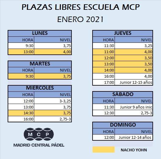 PLAZAS LIBRES ESCUELA MCP 04/01/2021 Si te cuadra alguna de las plazas libres de la imagen, ¡¡No los dejes escapar!! Contáctanos por whatsapp en el 608884708. Equipo MCP